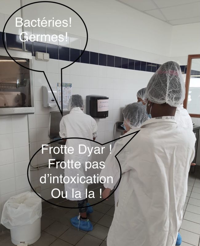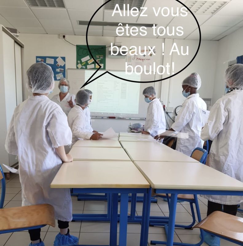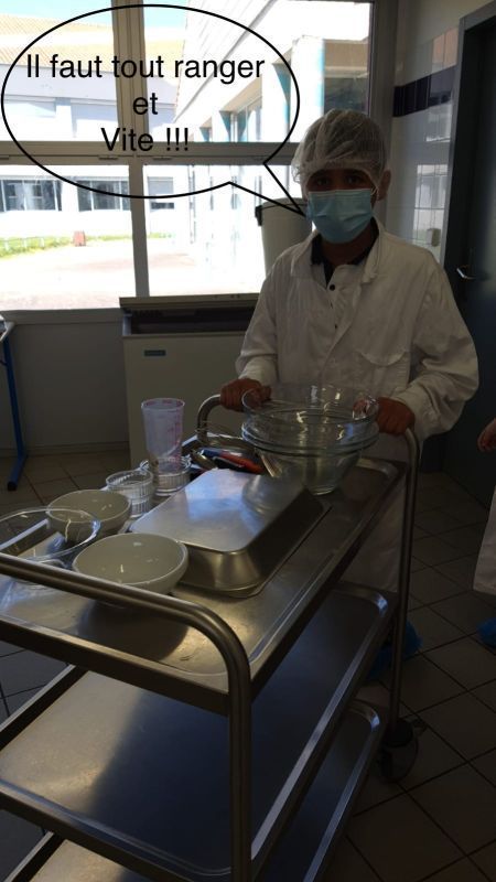 En premier, Mme ROBIN nous a donné les consignes à respecter dans le laboratoire puis les vêtements de protection et la recette de cuisine. Après par groupe de deux, nous avons organisé notre plan de travail, sorti les ustensiles et les ingrédients nécessaires pour notre recette.