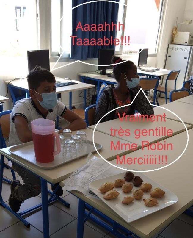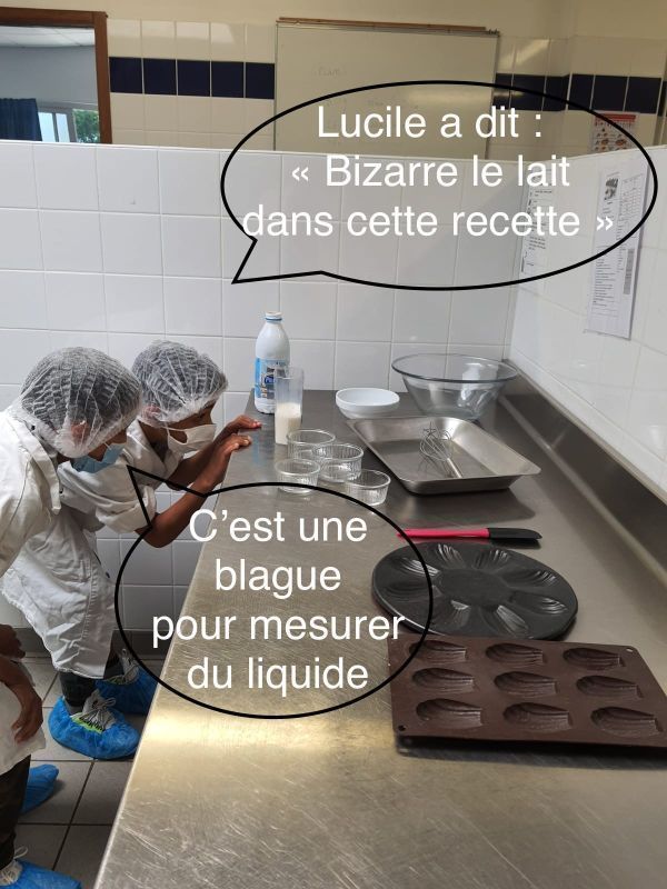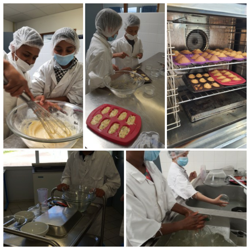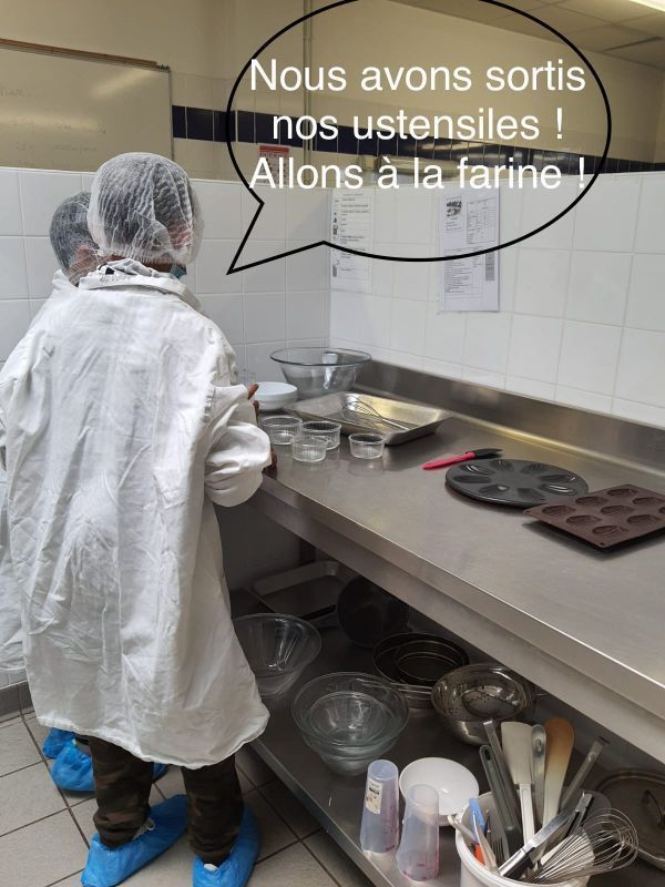 Adam a choisi des pépites de chocolat, Hamma de les faire nature. Fabrizio a mis du chocolat en poudre, Dyar et Fahad des pépites de chocolat eux aussi alors que Mariam a choisi les raisins secs. Tout le monde a ensuite rempli les moules à madeleine et Mme ROBIN a tout mis au four pendant que chaque groupe faisait la vaisselle.