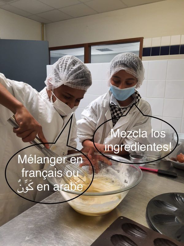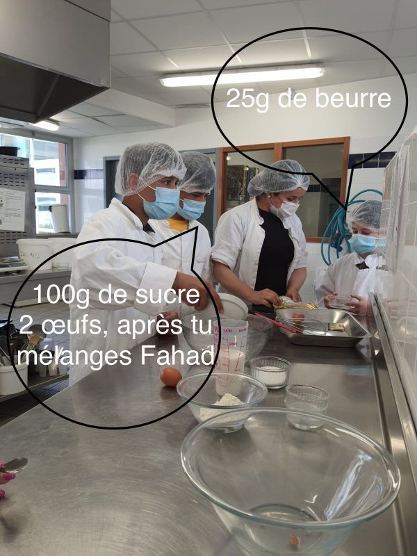 Le Collège Elie FAURE accueille des élèves primo arrivants qui ne parlent pas ou peu le français. Des cours spécifiques d’apprentissage de la langue (FLE) leur sont destinés et deux assistantes pédagogiques leur dispensent les premières notions du langage courant afin qu’ils puissent peu à peu intégrer tous les cours avec leurs camarades de classe. Afin de leur apprendre les différentes unités de mesure de poids, Mme Laïla EL BAKKALI, assistante pédagogique, a eu l’initiative d’organiser une séance de cuisine en collaboration avec Mme ROBIN, professeur en charge de l’atelier de cuisine de la SEGPA, et sa collègue Mme Lucile PERES, assistante pédagogique. Ils ont ainsi fait connaissance avec une enseignante qu’ils ne côtoient pas d’habitude et un environnement peu ordinaire : une cuisine professionnelle et ses équipements.