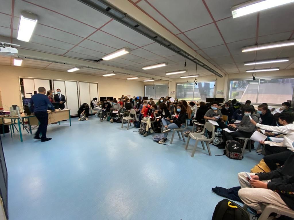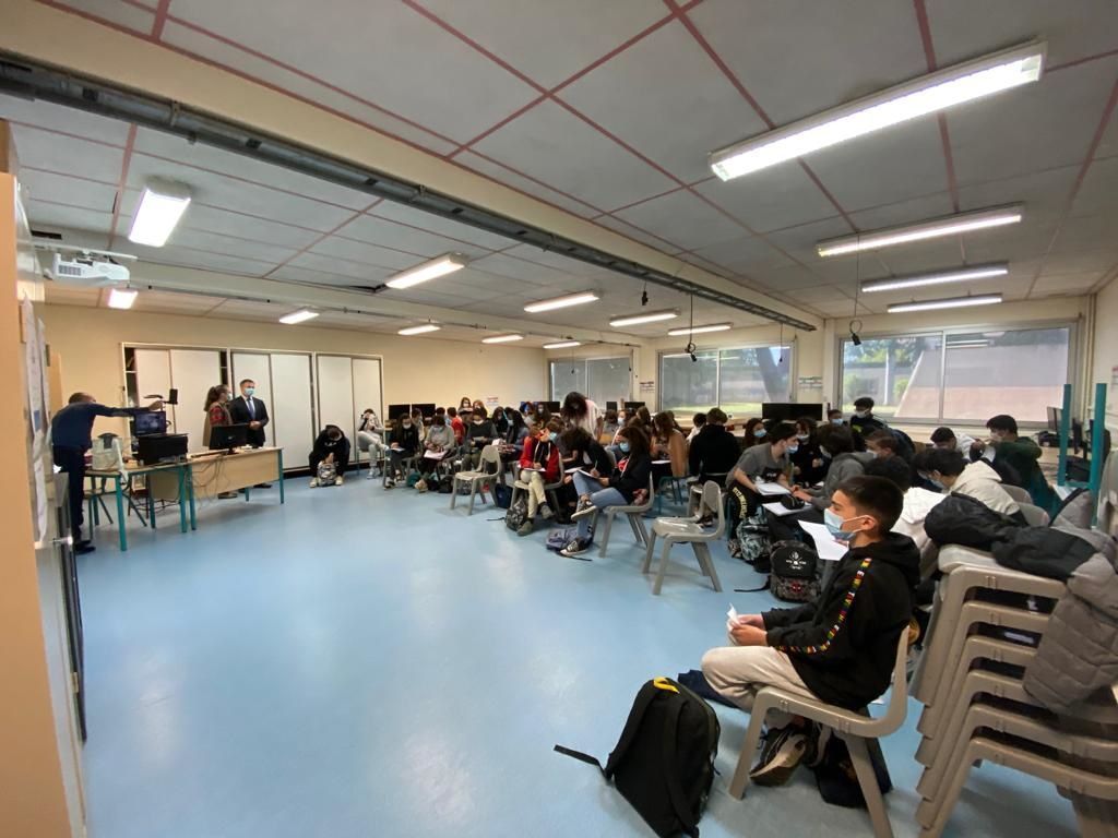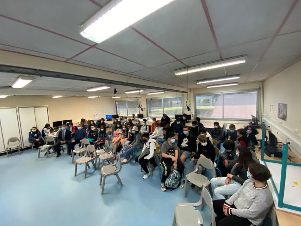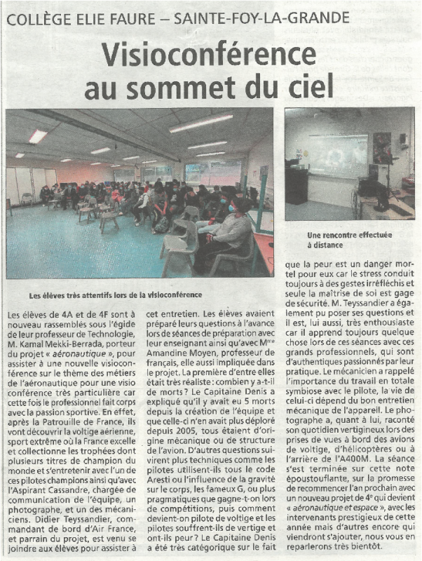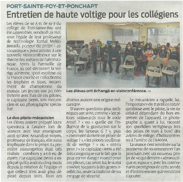 Les élèves de 4A et de 4F sont à nouveau rassemblés sous l’égide de leur professeur de Technologie, M. Kamal MEKKI-BERRADA, porteur du projet « aéronautique », pour assister à une nouvelle visio conférence sur le thème des métiers de l’aéronautique pour une visio conférence très particulière car cette fois le professionnel fait corps avec la passion sportive. En effet, après la Patrouille de France, ils vont découvrir la voltige aérienne, sport extrême où la France excelle et collectionne les trophées dont plusieurs titres de champion du monde et s’entretenir avec l’un de ces pilotes champions ainsi qu’avec l’Aspirant Cassandre, chargée de communication de l’équipe, un photographe, et un des mécaniciens. Didier TEYSSANDIER, commandant de bord d’Air France, et parrain du projet, est venu se joindre aux élèves pour assister à cet entretien.