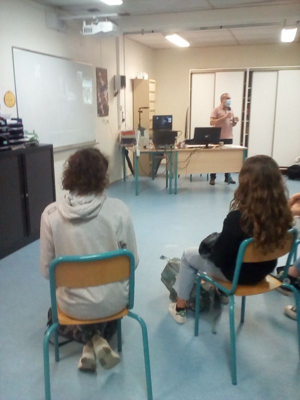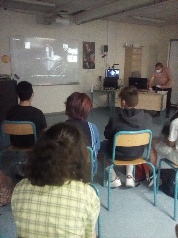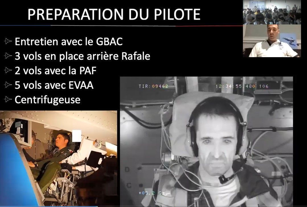 Il leur a également fait visionné un vol de démonstration ainsi qu’une partie filmée à l’intérieur du cockpit, les élèves ont ainsi entendu la respiration saccadée du pilote dénotant des contraintes physiques qu’il subit à cause des facteurs de charges accrus lors des figures acrobatiques, les fameux « G », même s’ils sont atténués par le port d’un pantalon anti-G et l’oxygénation directe du pilote via un masque surnommé « le groin », cela reste dangereux pour la santé et la vie du pilote qui risque de perdre connaissance en vol. Le Capitaine a insisté sur la préparation physique et mentale ainsi que l’hygiène de vie qui doivent être très rigoureux.