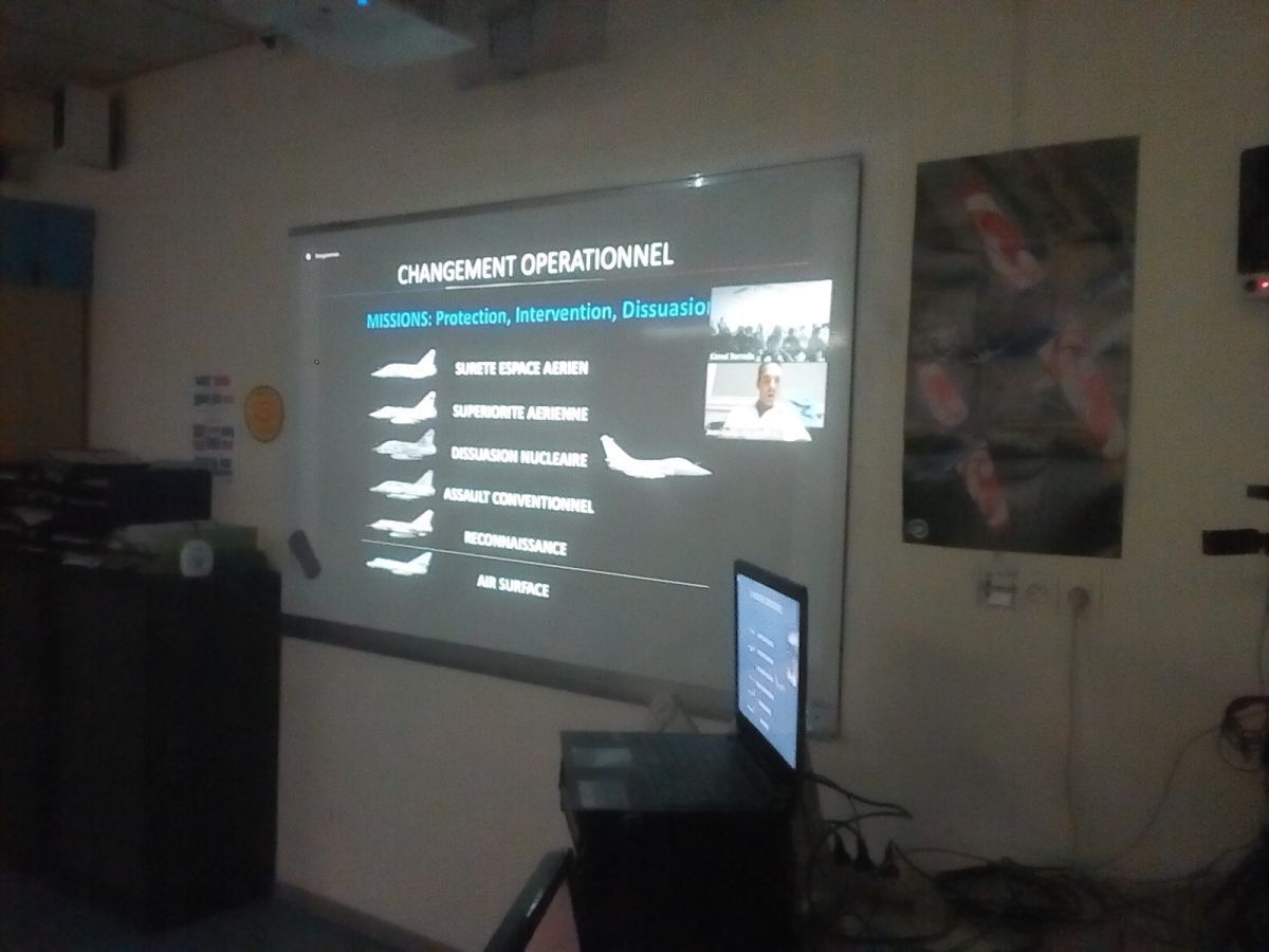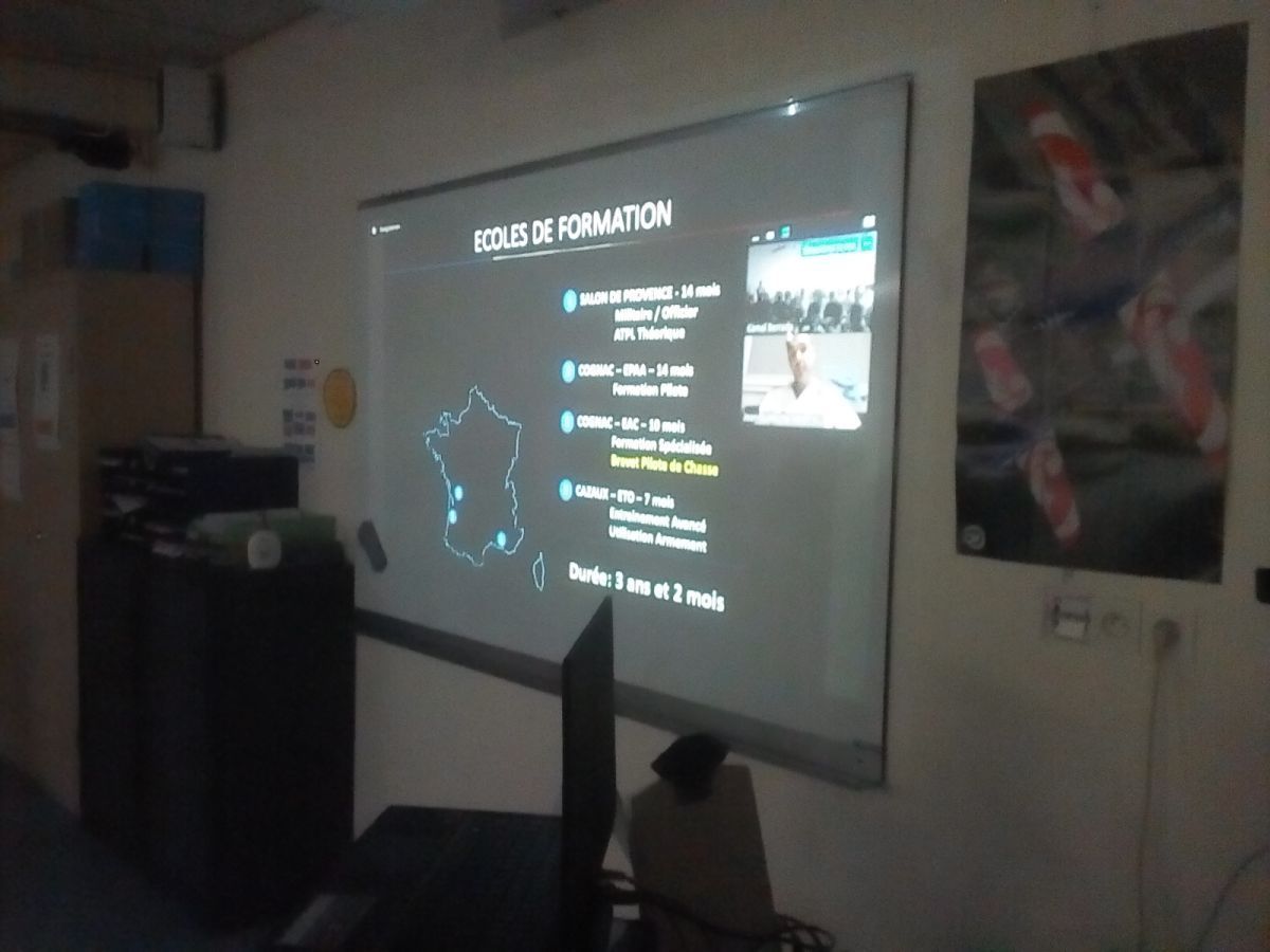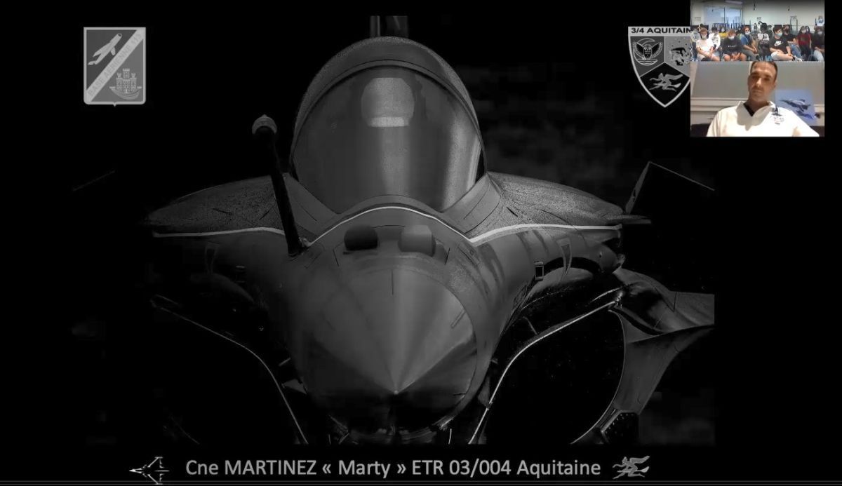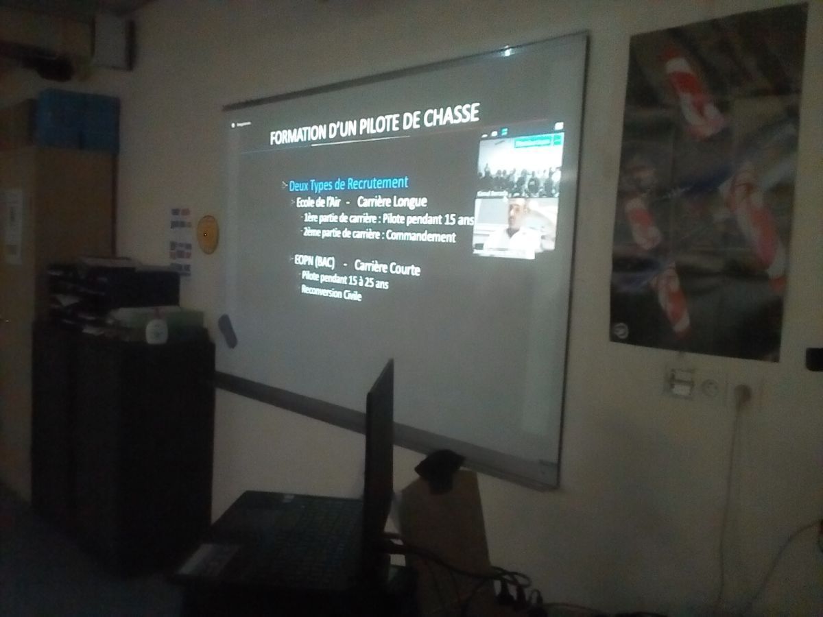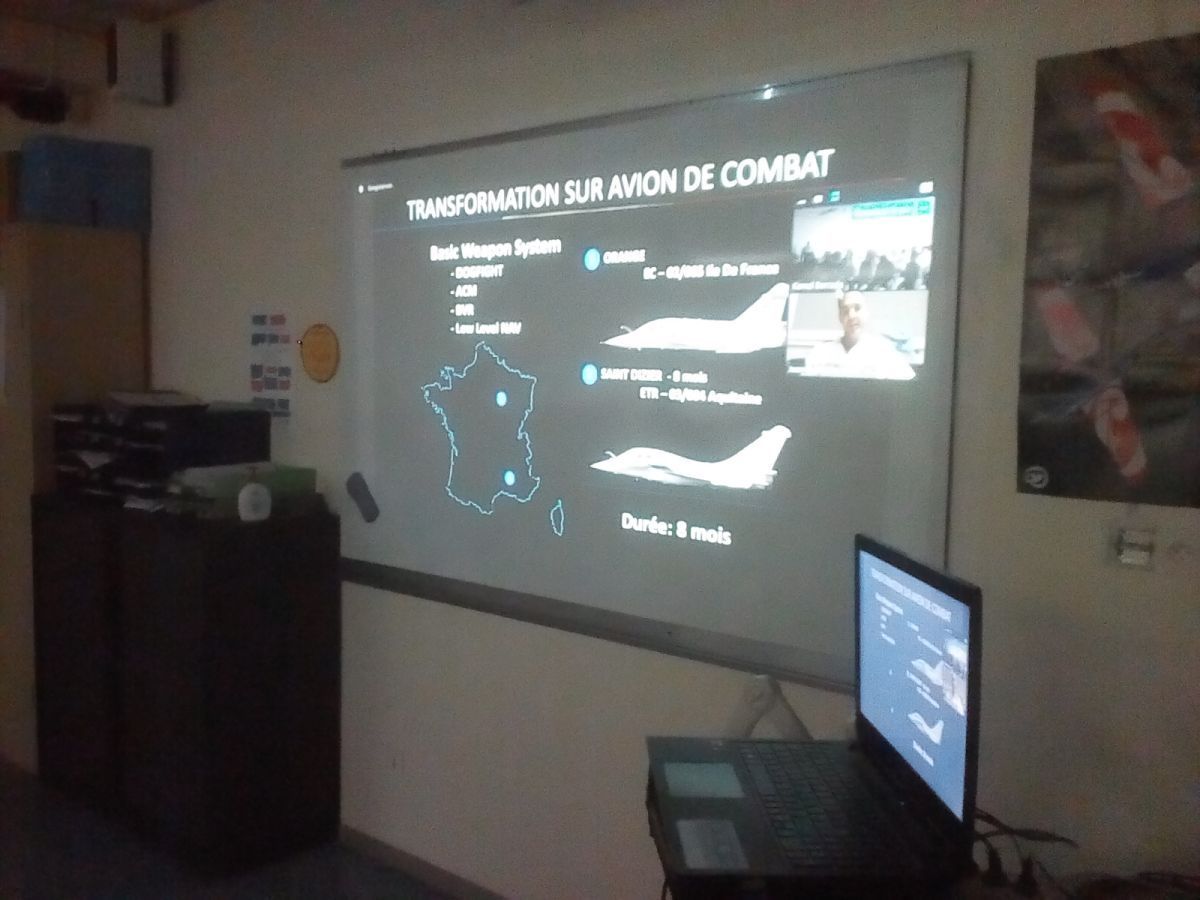 L’écran s’est animé, la connexion a été établi et le Capitaine est apparu, la conférence a commencé. Celui-ci entre en matière à l’aide d’un diaporama qui lui permet d’expliquer son parcours et les différentes voies d’accès au pilotage. Il a souligné qu’être pilote de chasse était son rêve de gosse et qu’il n’avait jamais piloté avant d’entrer dans l’Armée de l’Air, il a particulièrement insisté sur l’importance de s’accrocher à ses rêves parce qu’avec de la persévérance tout devient possible. Les élèves ont également pu voir le poste de pilotage du Rafale dont le Capitaine leur a décrit les différents instruments de bord.
