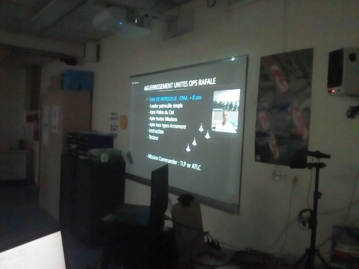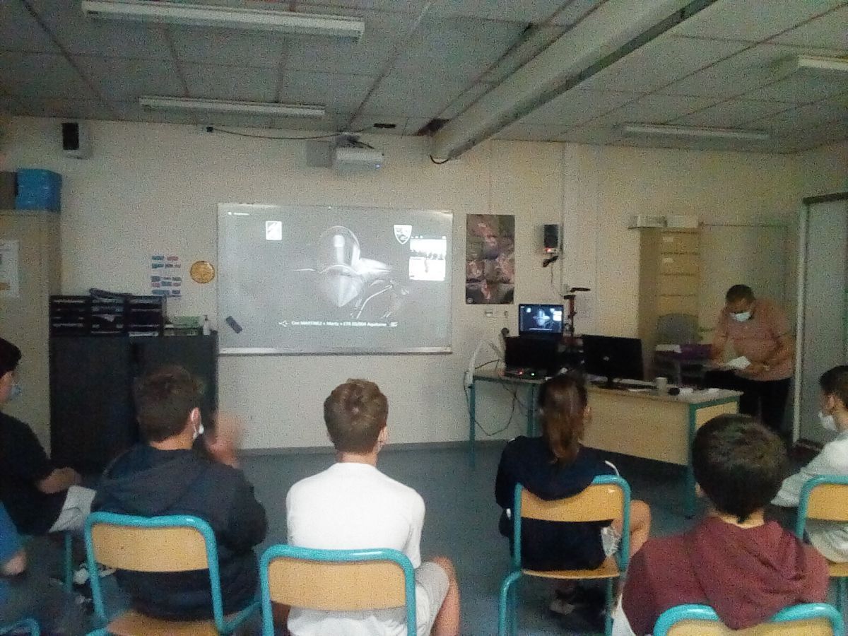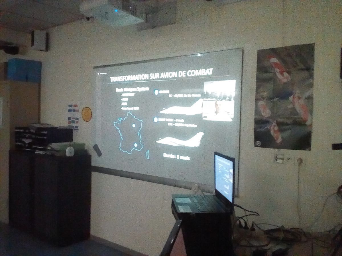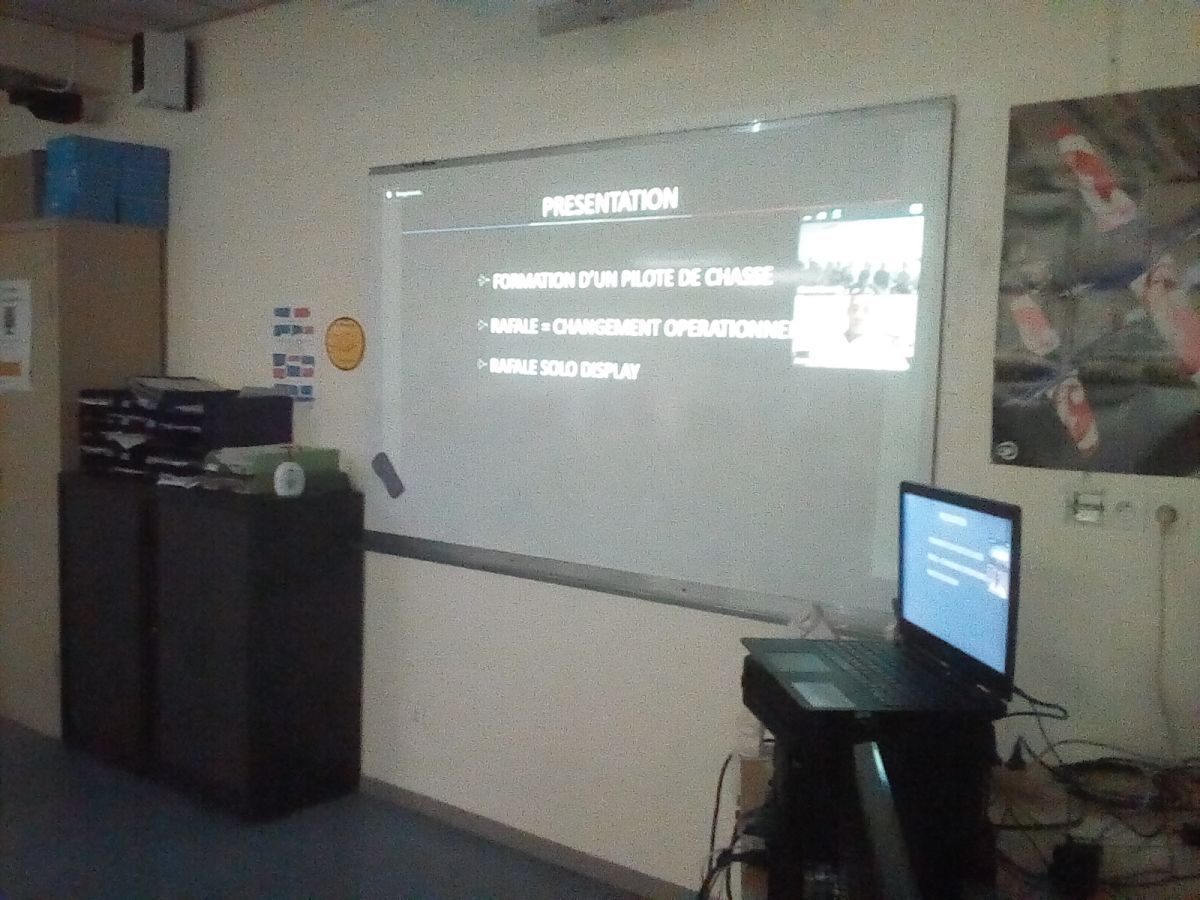 L’écran s’est animé, la connexion a été établi et le Capitaine est apparu, la conférence a commencé. Celui-ci entre en matière à l’aide d’un diaporama qui lui permet d’expliquer son parcours et les différentes voies d’accès au pilotage. Il a souligné qu’être pilote de chasse était son rêve de gosse et qu’il n’avait jamais piloté avant d’entrer dans l’Armée de l’Air, il a particulièrement insisté sur l’importance de s’accrocher à ses rêves parce qu’avec de la persévérance tout devient possible. Les élèves ont également pu voir le poste de pilotage du Rafale dont le Capitaine leur a décrit les différents instruments de bord.