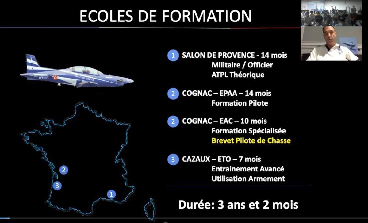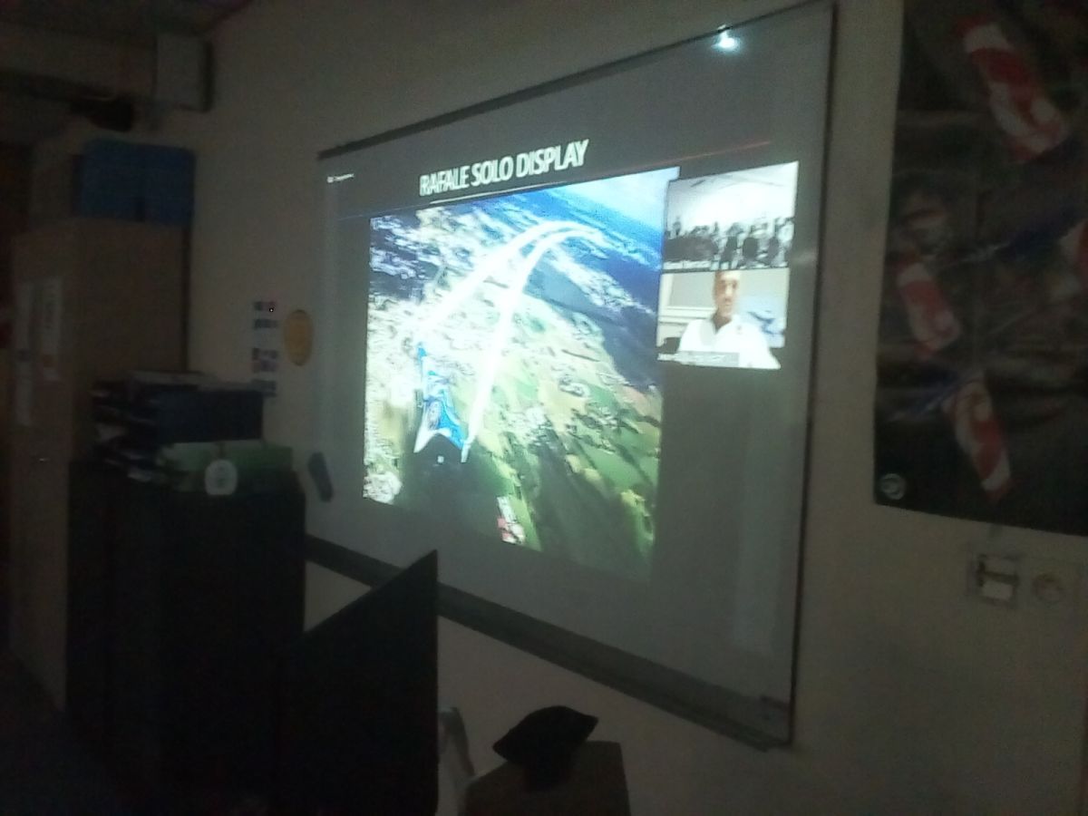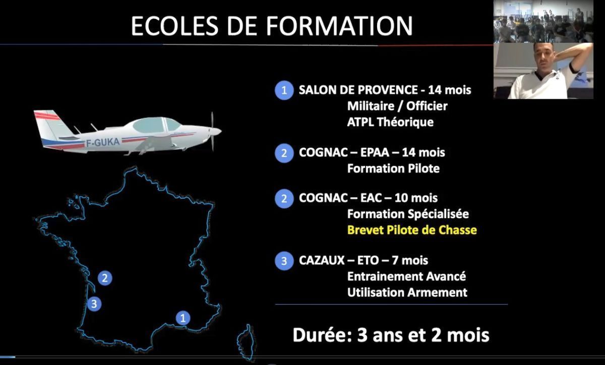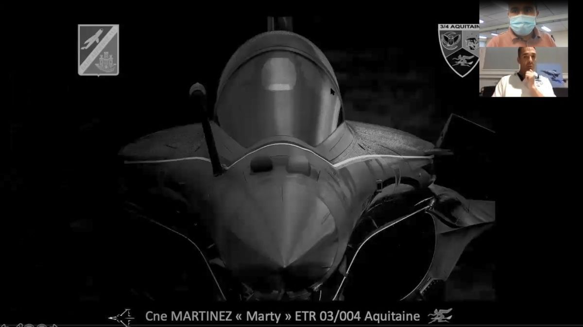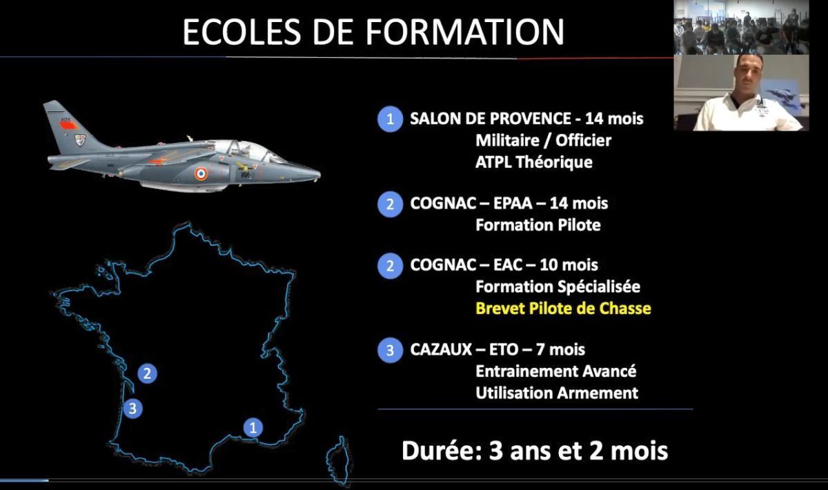 L’écran s’est animé, la connexion a été établi et le Capitaine est apparu, la conférence a commencé. Celui-ci entre en matière à l’aide d’un diaporama qui lui permet d’expliquer son parcours et les différentes voies d’accès au pilotage. Il a souligné qu’être pilote de chasse était son rêve de gosse et qu’il n’avait jamais piloté avant d’entrer dans l’Armée de l’Air, il a particulièrement insisté sur l’importance de s’accrocher à ses rêves parce qu’avec de la persévérance tout devient possible. Les élèves ont également pu voir le poste de pilotage du Rafale dont le Capitaine leur a décrit les différents instruments de bord.
