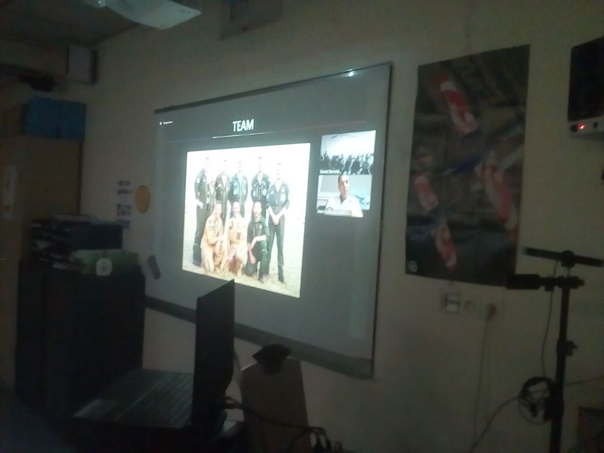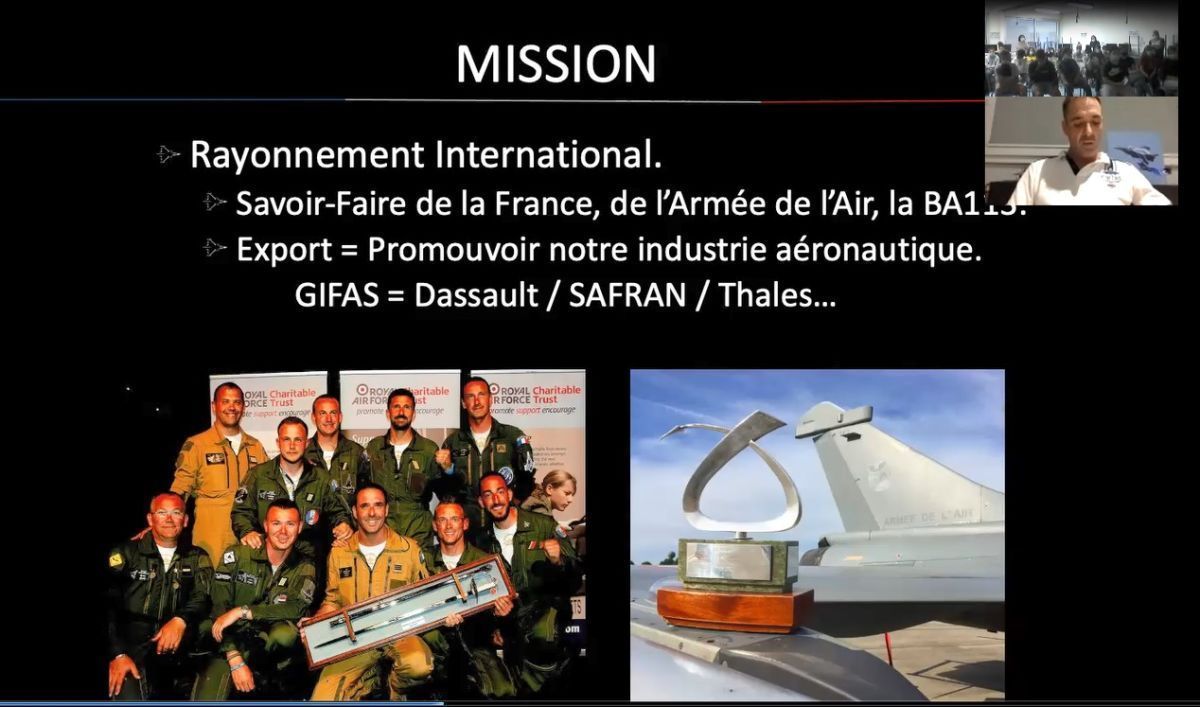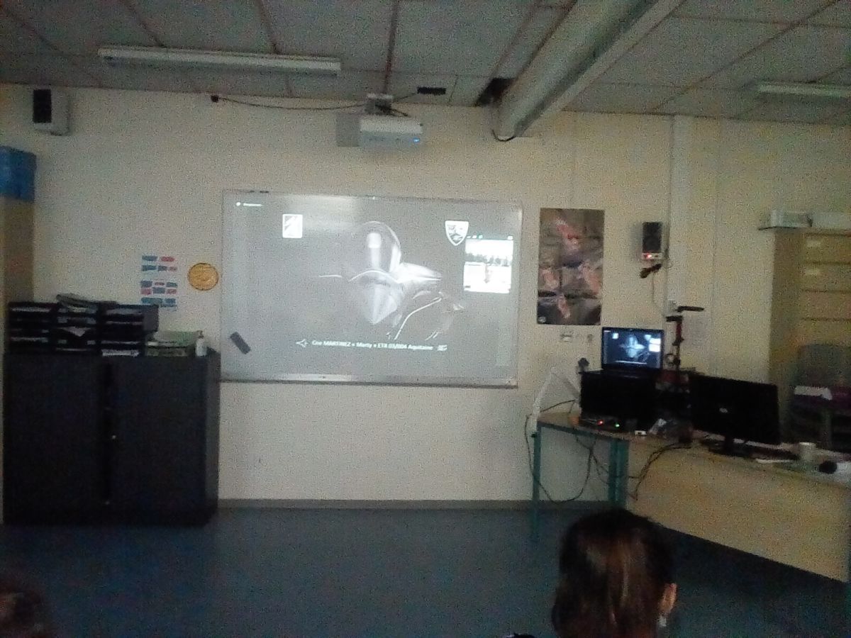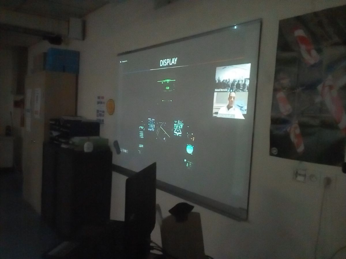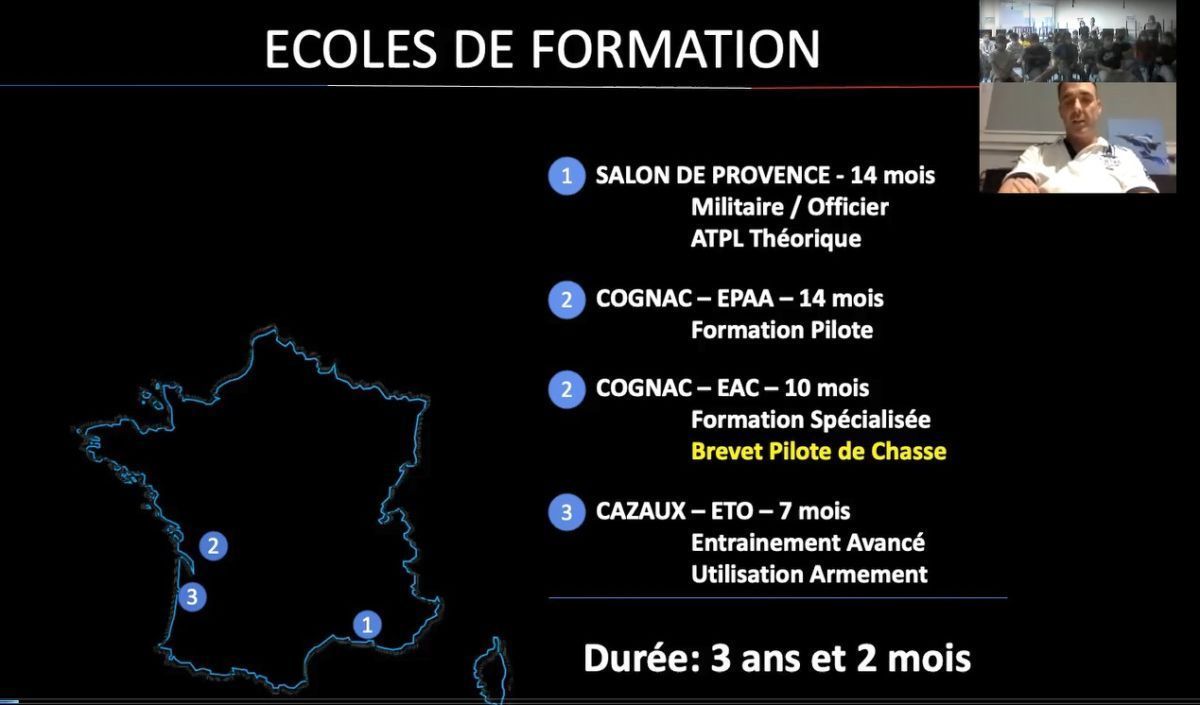 L’écran s’est animé, la connexion a été établi et le Capitaine est apparu, la conférence a commencé. Celui-ci entre en matière à l’aide d’un diaporama qui lui permet d’expliquer son parcours et les différentes voies d’accès au pilotage. Il a souligné qu’être pilote de chasse était son rêve de gosse et qu’il n’avait jamais piloté avant d’entrer dans l’Armée de l’Air, il a particulièrement insisté sur l’importance de s’accrocher à ses rêves parce qu’avec de la persévérance tout devient possible. Les élèves ont également pu voir le poste de pilotage du Rafale dont le Capitaine leur a décrit les différents instruments de bord.