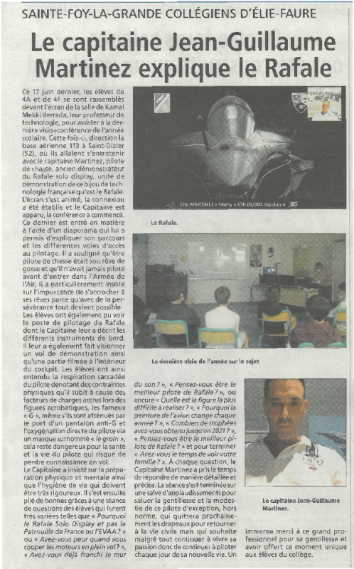 Ce 17 juin 2021, les élèves de 4A et de 4F se sont rassemblés devant l’écran de la salle de M. MEKKI BERRADA, leur professeur de technologie, pour assister à la dernière visio conférence de l’année scolaire. Cette fois-ci, direction la base aérienne 113 à SAINT-DIZIER, où ils allaient s’entretenir avec le Capitaine MARTINEZ, pilote de chasse, ancien démonstrateur du Rafale Solo Display, unité de démonstration de ce bijou de technologie française qu’est le Rafale.
