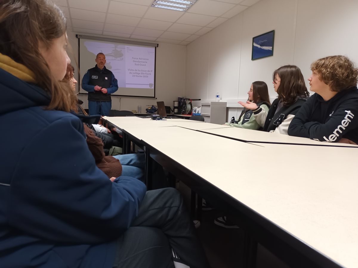 Afin de sensibiliser les élèves aux rôles des forces de sécurité intérieure, le lieutenant-colonel Frédéric avait préparé un diaporama très pédagogique pour illustrer ses propos. Il leur rappela tout d'abord que la mission principale de la Gendarmerie Nationale et de la Police Nationale était avant tout de protéger les personnes et les biens et de faire respecter la loi. Les élèves eurent ainsi un cours d'EMC très concret lorsqu'il expliqua que la loi était votée à l'Assemblée Nationale par les représentants du peuple que sont les députés, élus de la République, et qu'à ce titre, une loi devait être appliquée par tous même si celle-ci pouvait sembler inopportune, pour maintenir l'équilibre et l’ordre dans une société démocratique. Et donc, la mission des forces de l'ordre est de faire respecter la loi qui permet de protéger les personnes et les biens. Il mentionna des exemples concrets tels que les excès de vitesse ou les dégradations et vols. Le lieutenant-colonel Frédéric leur relata également son parcours professionnel de pilote d'hélicoptère, qui l'a amené à devenir commandant de la force aérienne Sud-Ouest.