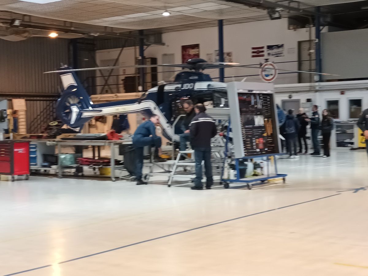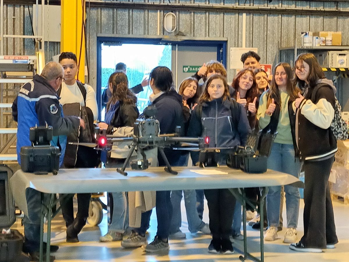 Puis, les élèves purent assister au départ de l’Écureuil qui devait rejoindre une autre section en dépannage. Au décollage, le pilote éleva sa machine en vol stationnaire de quelques mètres au dessus du tarmac, la fit pivoter, et salua les jeunes collés aux fenêtres du hangar qui ne perdaient pas une miette de la manœuvre, allumant son phare et en inclinant l'avant de l'appareil en guise de salutation, déclenchant chez le public conquis une vague de joie. Certains des élèves n'ayant jamais vu un hélicoptère décoller, cette première les a beaucoup enthousiasmé. Ils firent ensuite la connaissance du maréchal-des-logis-chef Daniel qui leur fit partager son expertise de télépilote de drone. Il leur expliqua toutes les performances de l'appareil ainsi que les capacités de sa caméra infra rouge et son utilisation, tel que la sécurisation d'événements de masse. Toutefois, il rappela qu'à cause de la législation concernant le droit à l'image, l'utilisation du drone restait très encadrée. Il a su communiquer sa passion aux jeunes qui ont passé un très long moment en sa compagnie, permettant peut-être de susciter des vocations envers ce métier particulier et méconnu.