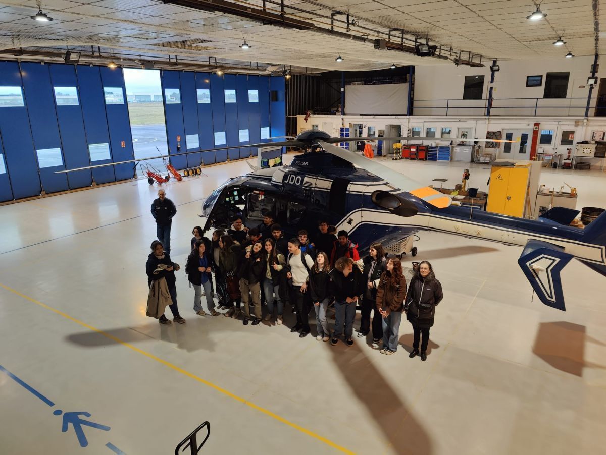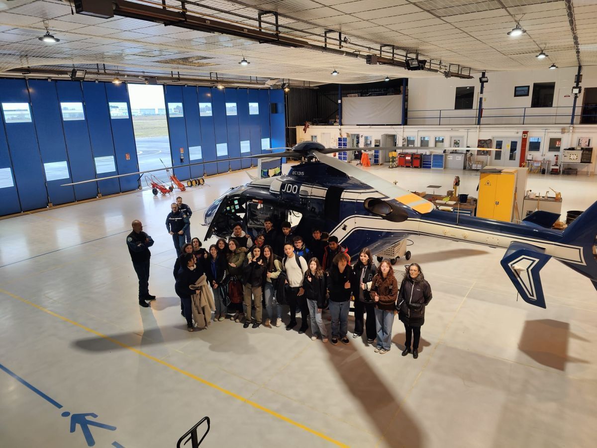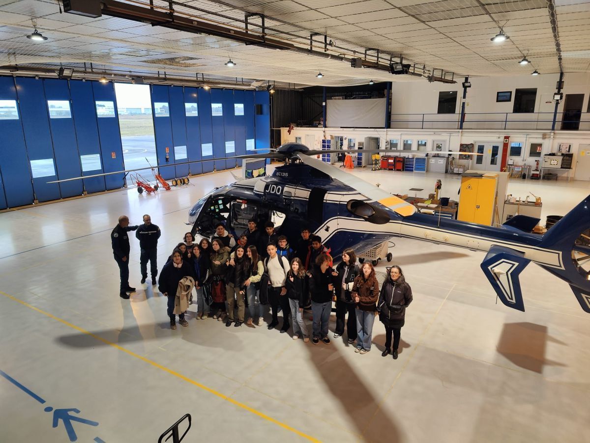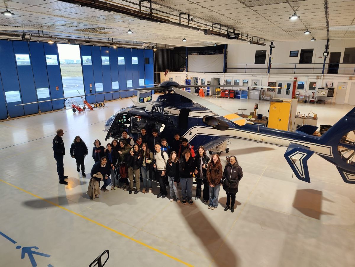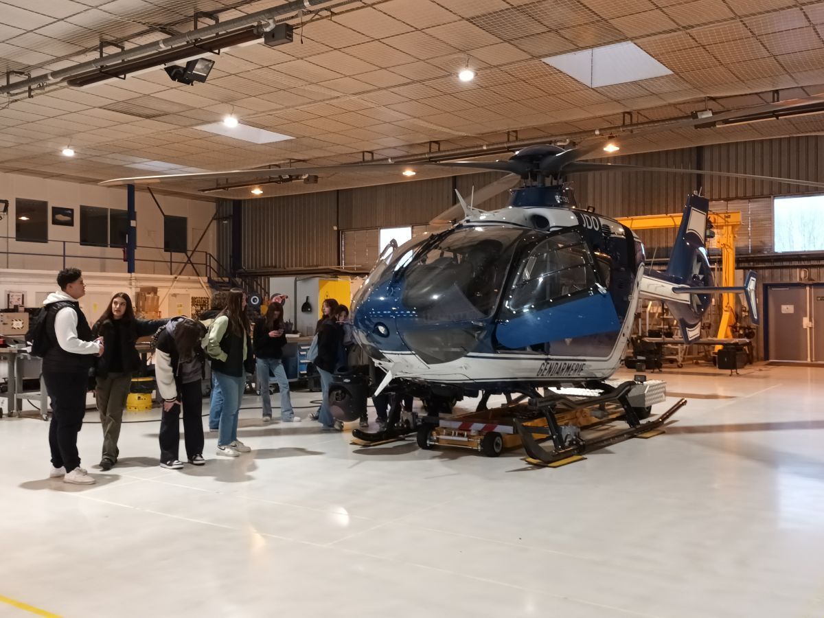 Par cet après midi pluvieux de début mars, les élèves de 3ème de la classe à projet aéronautique et leurs accompagnateurs ont été chaleureusement accueillis par le lieutenant-colonel Frédéric et ses hommes à la base de la Section Aérienne de la Gendarmerie. Située sur l'aéroport de Bordeaux Mérignac, voisine de la Sécurité Civile, la Force Aérienne Gendarmerie Sud-Ouest couvre un large quart de la France depuis la côte basque jusqu'en Corrèze. Le but de cette visite était de faire découvrir les missions des unités aériennes de la Gendarmerie et les métiers qui la composent, ainsi que les deux hélicoptères de la section : l'EC 135, surnommé Choucas et l’Écureuil.