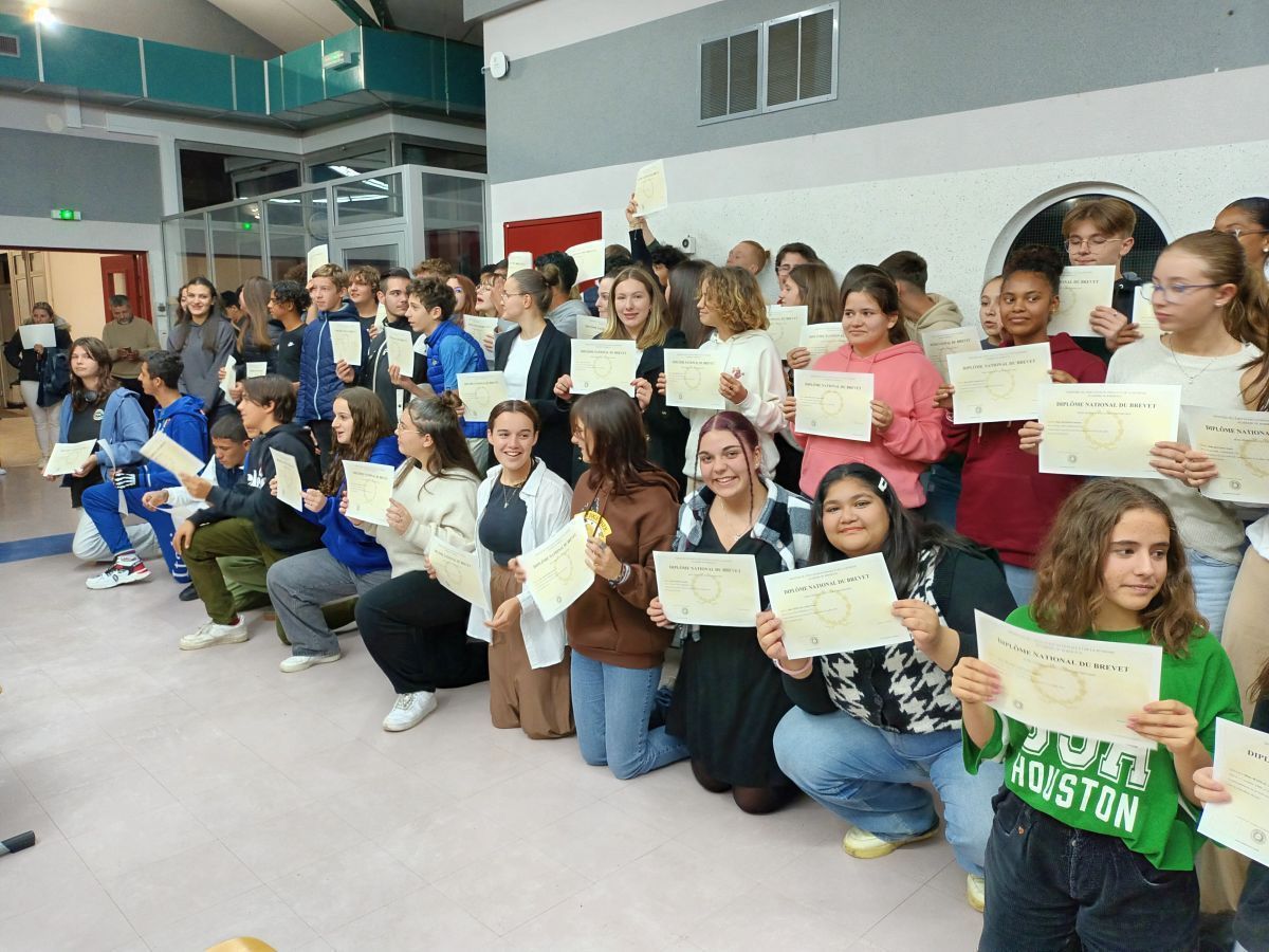 La foule des parents et des anciens élèves se bouscule à l’entrée du collège malgré le mauvais temps et les restrictions d’accès du plan Vigipirate. La quasi-totalité des troisièmes de l’an dernier est venue recevoir son premier diplôme dans une joyeuse ambiance, la grande salle de restauration peine à contenir familles et jeunes impatients. Christelle Guionie, Maire de Ste Foy la Grande, ainsi que des élus dont Catherine Driot, Ste Foy la Grande et Sandrine Ratié, Pineuilh, toutes deux en charge du Conseil Municipal des Jeunes dans leurs communes respectives.