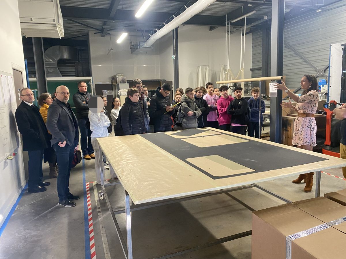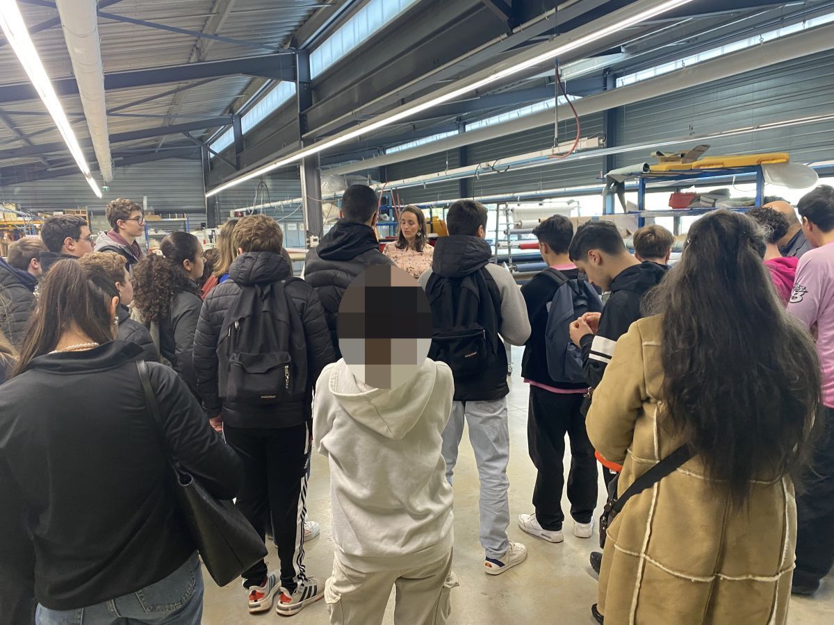 Journée de découverte de l’industrie pour les élèves de 3ème de la classe projet « Aéronautique et Espace ». C’est donc sous un soleil radieux que l’équipe pédagogique a conduit les élèves à Mérignac. La première visite a été organisée par Tarmaq, cité des savoirs aéronautiques et spatiaux. Les élèves sont reçus par la PME SDA Sellerie, Décoration, Aménagements. Le fondateur de cette petite structure de taille familiale travaillait dans la sellerie chez Dassault Aviation avant de créer sa propre entreprise, qui depuis lors, travaille en partenariat avec Dassault Aviation. Cette société, très haut de gamme, fabrique l’habillage de l’intérieur des jets d’affaires : fauteuils, rideaux, moquettes, coussins… avec des matériaux rares et de luxe. Ici tout est fait à la main et sur mesure, chaque pièce est unique. Plusieurs employés sont décorés meilleurs ouvriers de France. Marc Pécheux, un des responsables de Tarmaq, souligne qu’il s’agit de la haute couture aéronautique, les tissus utilisés viennent d’ailleurs de grandes marques de luxe ou portent l’étiquette de grands couturiers. Les élèves ont pu échanger et poser plein de questions sur la sellerie, la maroquinerie et la tapisserie d’ameublement.