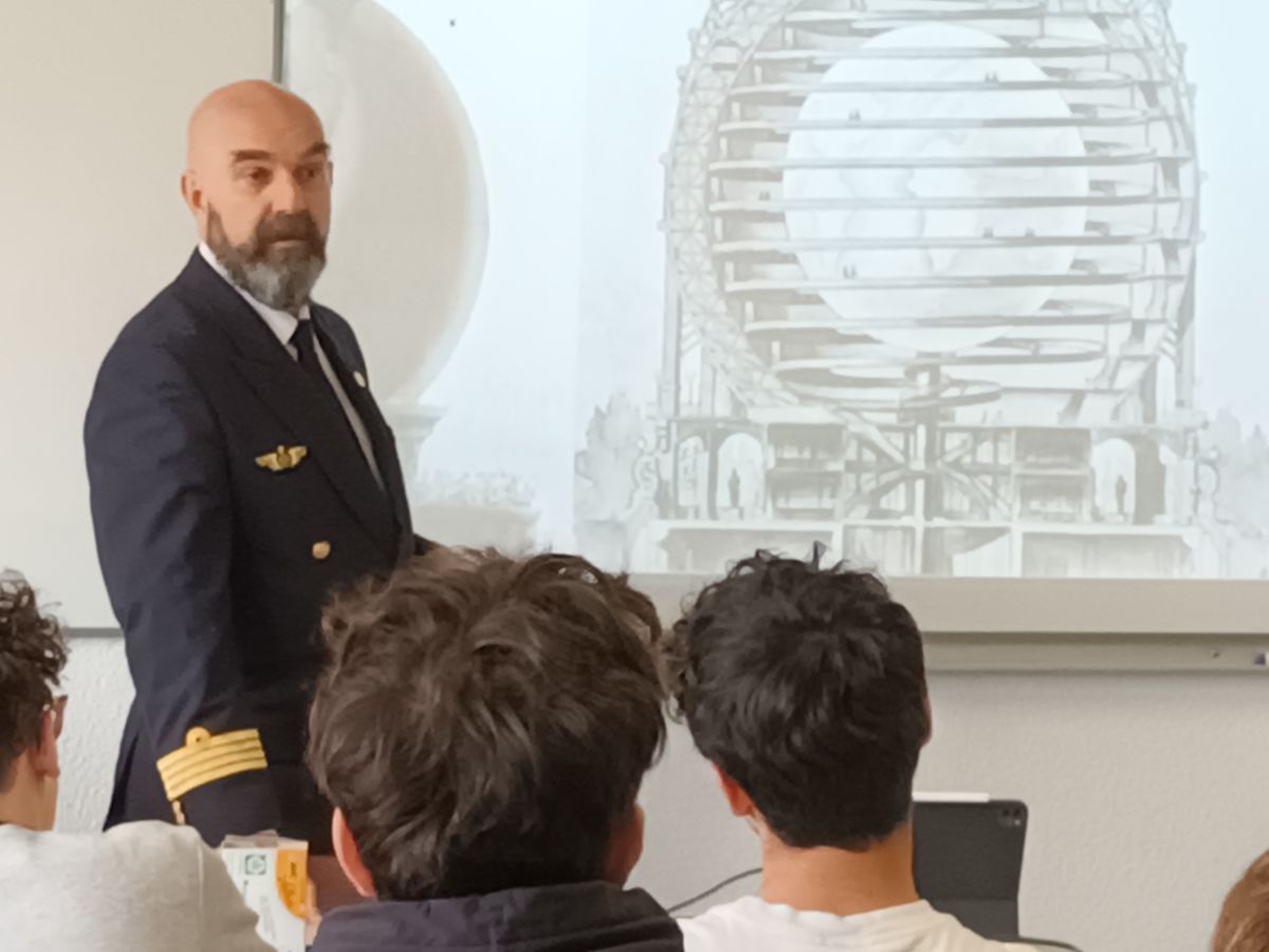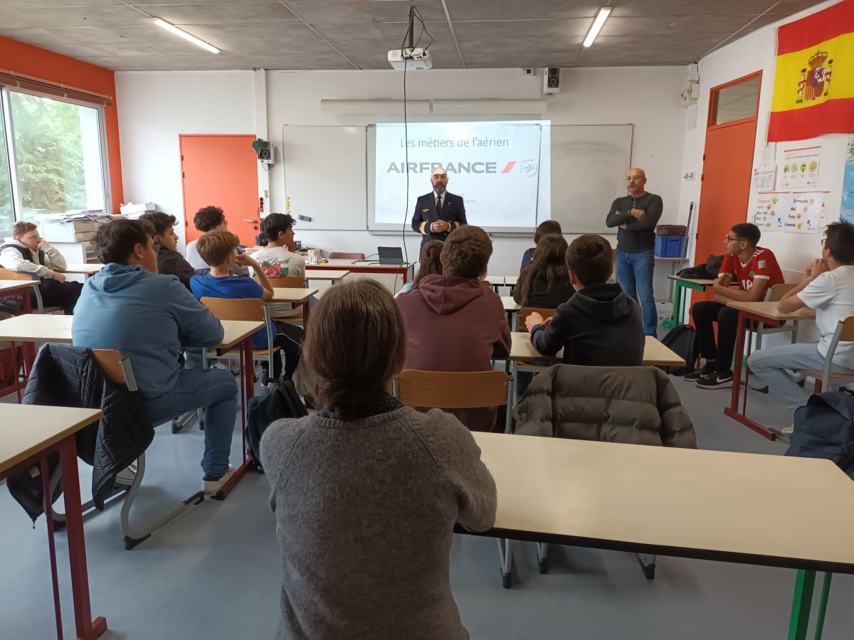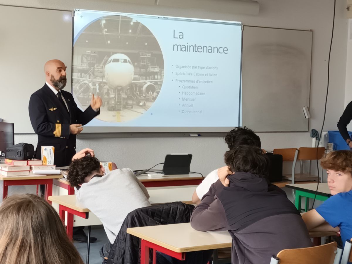 Il a ensuite enchaîné sur les différents métiers de l'aéroport puis de la compagnie civile de transport de passagers et de fret, mais c'est tellement vaste qu'il est difficile de tout aborder en seulement deux heures ! Enfin, il a parlé de son propre métier et des rôles des personnels navigants, rappelant qu'il travaille en équipage à bord de son avion. Il a ponctué son récit d'exemples et d'anecdotes vécues sur le terrain, ce qui a beaucoup captivé les élèves et surtout ils ont pu lui poser toutes leurs questions tout au long de la conférence, ce fut un moment très vivant et intense. D'ailleurs bien trop court de l'avis de tous les participants !